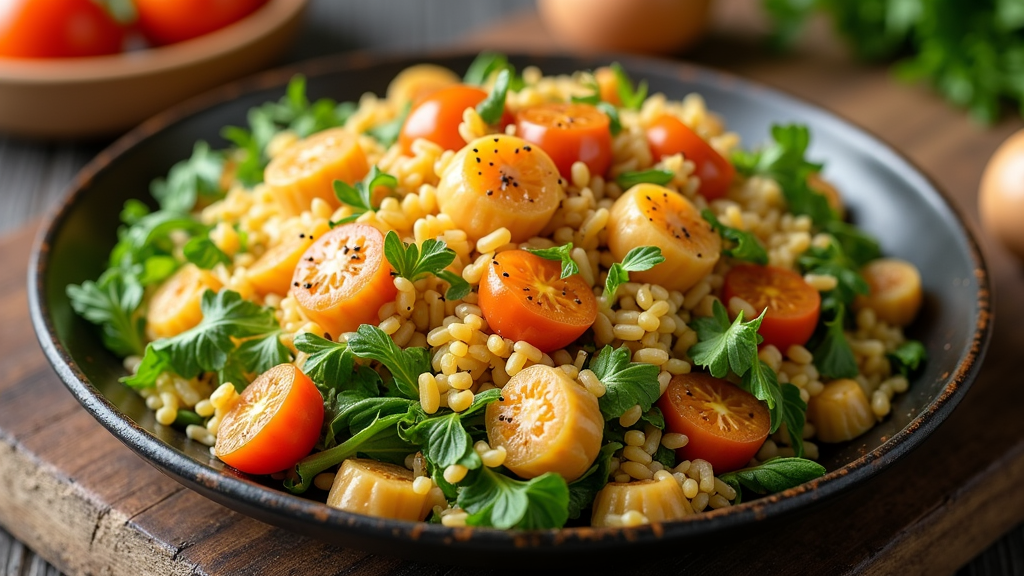 Penyajian makanan sehat untuk penderita sendi yang mencakup sayuran segar, biji-bijian, dan protein tanpa lemak dalam hidangan yang praktis dan dapat disiapkan setiap hari.