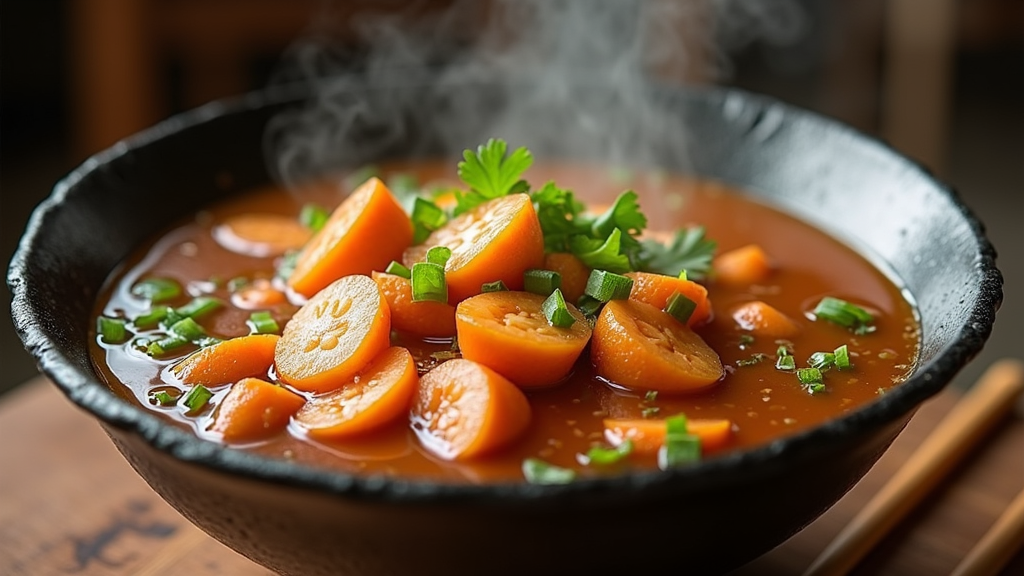 Ilustrasi piring sup tahu yang mengandung tahu panggang, brokoli, dan buncis, menampilkan warna-warna segar dan menarik.